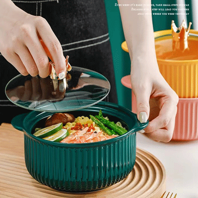 Each bowl features a convenient handle and a lid, which makes them perfect for enjoying soup, stews, or any other warm dish. The lid keeps your food warm and prevents any spills or splatters. The handle makes these bowls easy to carry and move around, which is especially helpful when you want to serve your guests without any hassle.